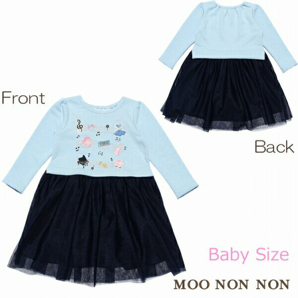 子供服 女の子 ワンピース・ジャンパースカート 長袖 普段着 通園着 お出かけ着 ベビーサイズ 音符&楽器モチーフ裏毛 チュール切り替えドッキング ブルー 90cm 95cm 【むーのんのん moononnon】
