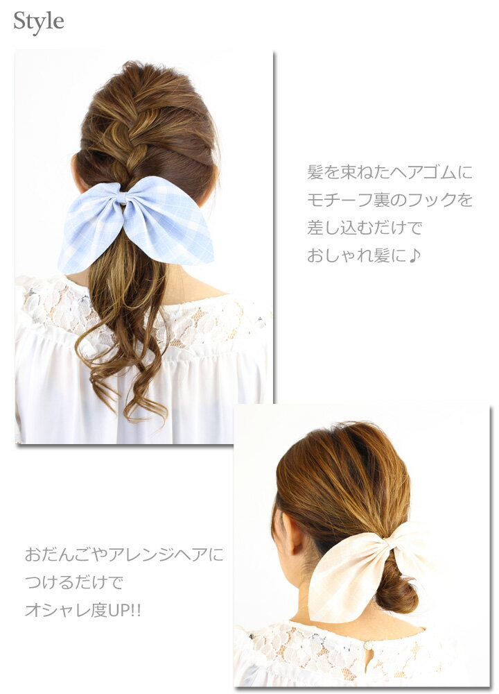 商品説明 使い方は髪を束ねたヘアゴムにモチーフ裏のフックをひっかけるだけ!! いままでのモチーフつきヘアゴムですとモチーフの位置や向きが思ったように決まらなかったり、 ゴムが伸びてしまって使えなくなってしまったりと。