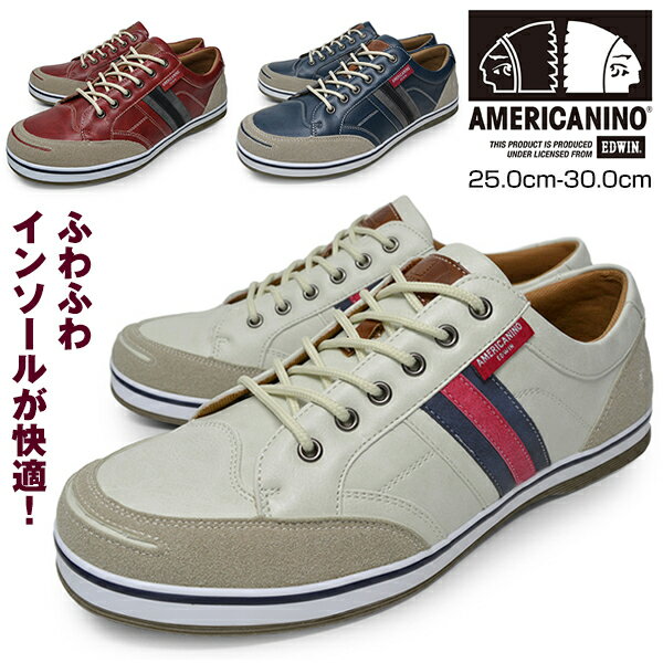 【 期間限定ポイント5倍 2月8日 19時59分まで 】 メンズ スニーカー ローカット 軽量 カジュアルシューズ 靴 くつ ブランド AMERICANINO EDWIN AE889 WHITE NAVY RED アメリカニーノ エドウィン 合成皮革 かっこいい おしゃれ 大きいサイズ 28cm 29cm 30cm 対応