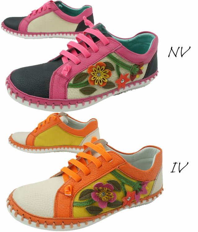 【送料無料】 エスタシオン Estacion レディース スニーカー 本革 レザー W205 ローカット ゴム紐 花 フラワー アイボリー ネイビー カラフル